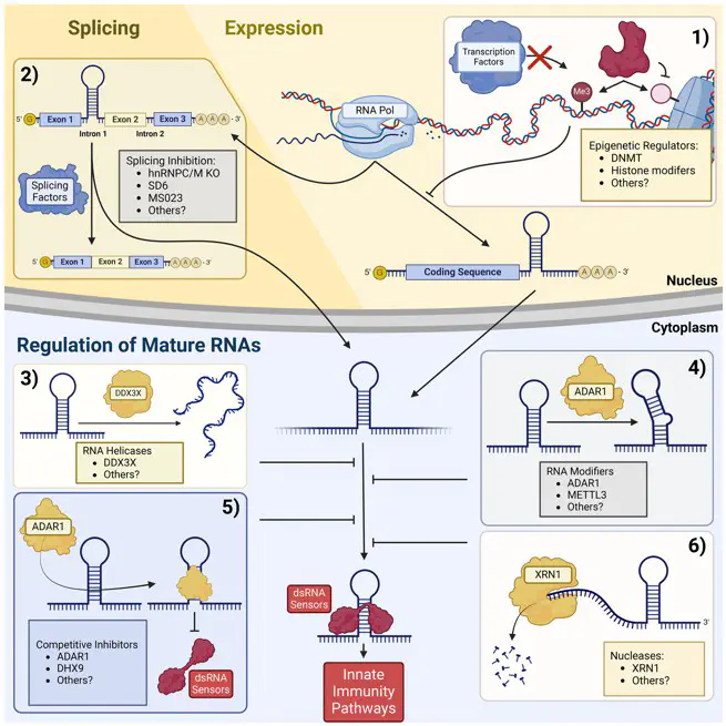 Immunotherapy has emerged as a therapeutic option for many cancers. For some tumors, immune checkpoint inhibitors show great efficacy in promoting anti-tumor immunity. However, not all tumors respond to immunotherapies. These tumors often exhibit reduced inflammation and are resistant to checkpoint inhibitors. Therapies that turn these ‘cold’ tumors ‘hot’ could improve the efficacy and applicability of checkpoint inhibitors, and in some cases may be sufficient on their own to promote anti-tumor immunity. One strategy to accomplish this goal is to activate innate immunity pathways within the tumor. Here we describe how this can be accomplished by activating double-stranded RNA (dsRNA) sensors. These sensors evolved to detect and respond to dsRNAs arising from viral infection but can also be activated by endogenous dsRNAs. A set of proteins, referred to as suppressors of dsRNA sensing, are responsible for preventing sensing ‘self’ dsRNA and activating innate immunity pathways. The mechanism of action of these suppressors falls into three categories; (1) Suppressors that affect mature RNAs through editing, degradation, restructuring, or binding. (2) Suppressors that affect RNA processing. (3) Suppressors that affect RNA expression. In this review we highlight suppressors that function through each mechanism, provide examples of the effects of disrupting those suppressors in cancer cell lines and tumors, and discuss the therapeutic potential of targeting these proteins and pathways.